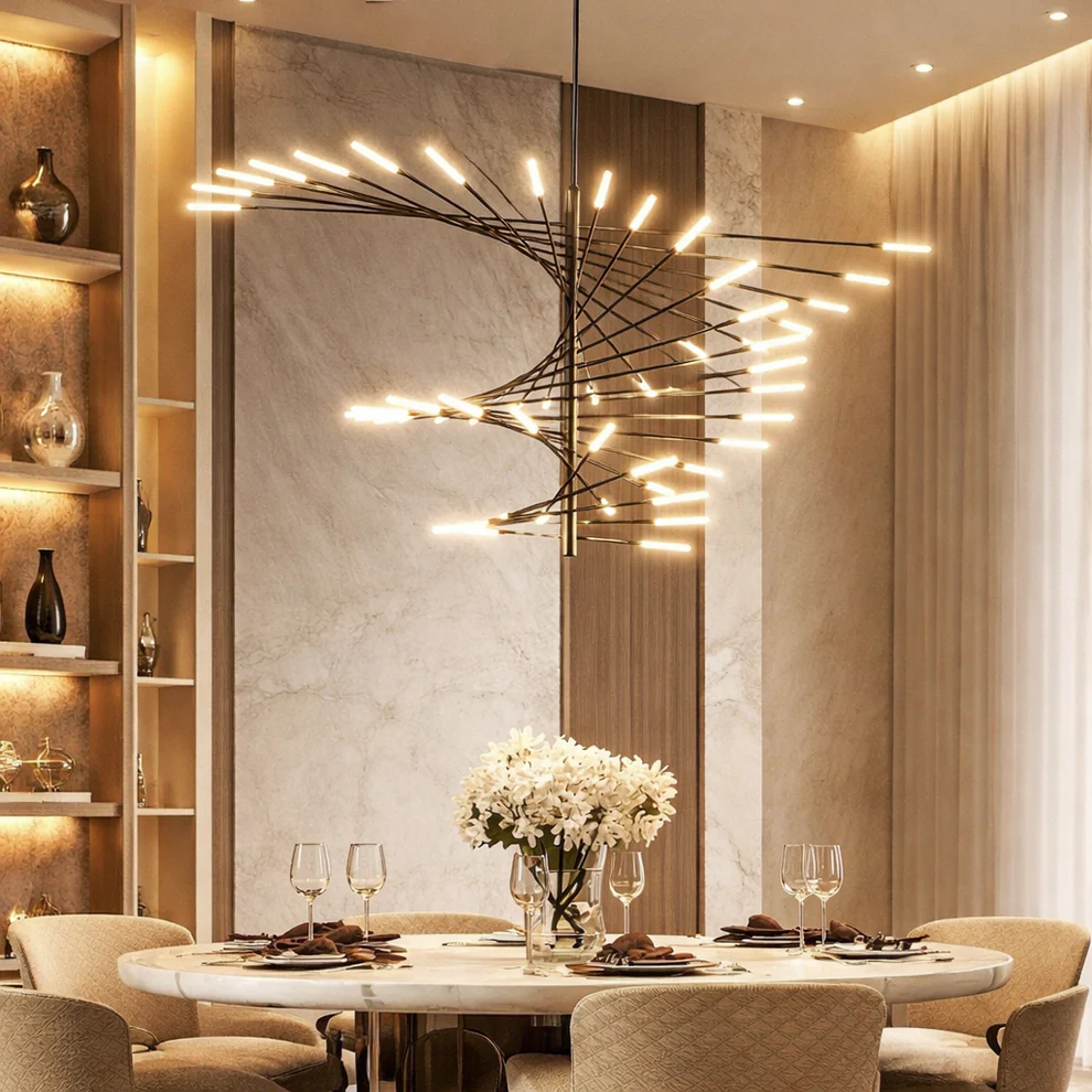 These modern chandeliers mix strong shapes with flowing ones. They add movement and excitement to your room. If you want your home to look new and stylish, these lights are a smart pick.