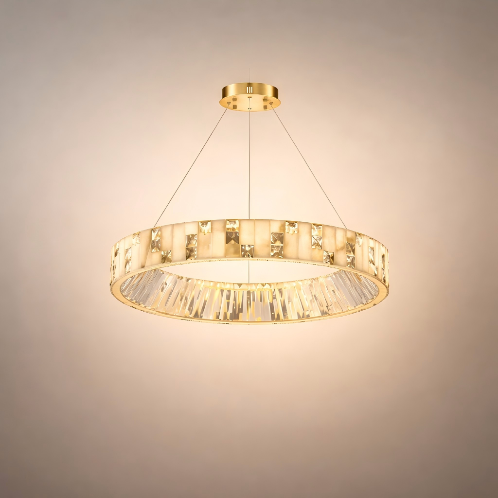 Excelis Modern Layered Alabaster Ring Chandelier – Brushed Gold Stainless Steel Framea