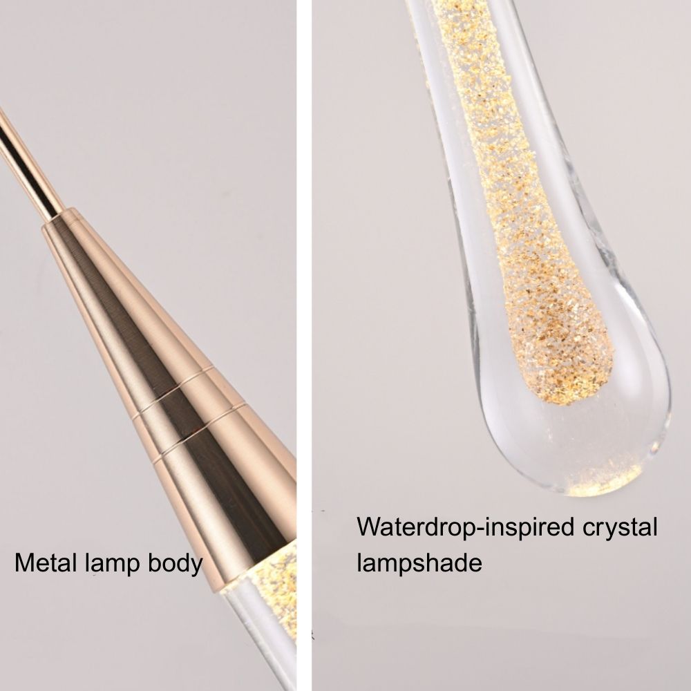 Metallrahmen kombiniert mit einem tropfenförmigen Kristallschirm, der für effektive Lichtstreuung und ein edles Erscheinungsbild sorgt.