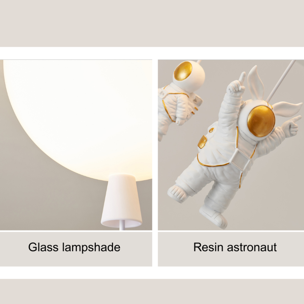- Die Leuchte verfügt über kugelförmige Acrylschirme in drei Größen – 9,8" (25 cm), 11,8" (30 cm) und 13,8" (35 cm) – und eine verspielte Astronautenfigur als dekorativen Blickfang.