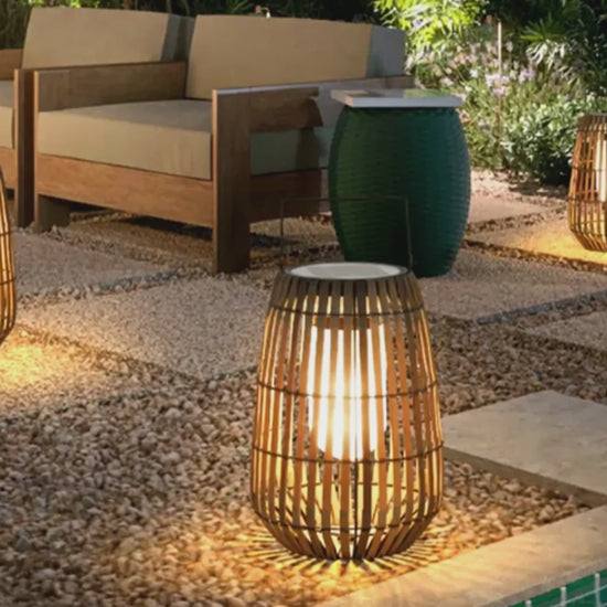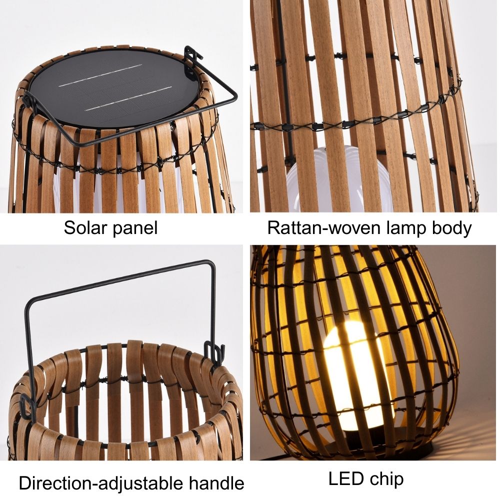 Der Korpus aus geflochtenem Rattan verleiht Außenbereichen einen rustikalen Charme. Ausgestattet mit energieeffizienter LED-Beleuchtung und Solarpanel sowie einem verstellbaren Griff für flexible Einsatzmöglichkeiten.