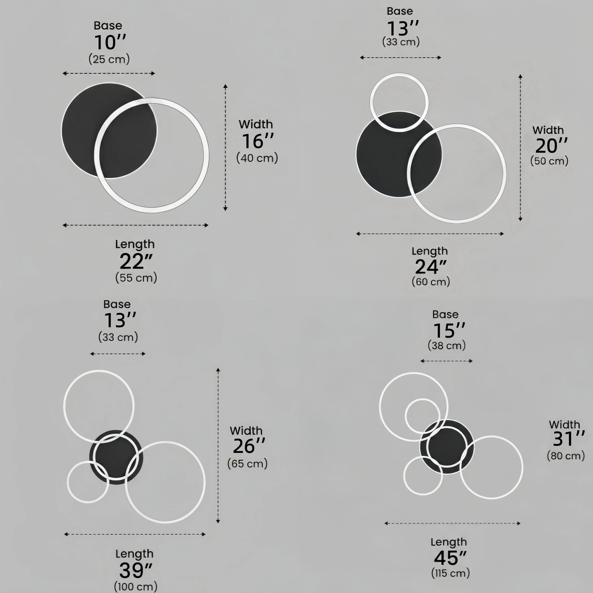 - Ceiling Base Diameter: 10" (25 cm) / 13" (33 cm) / 13" (33 cm) / 15" (38 cm)