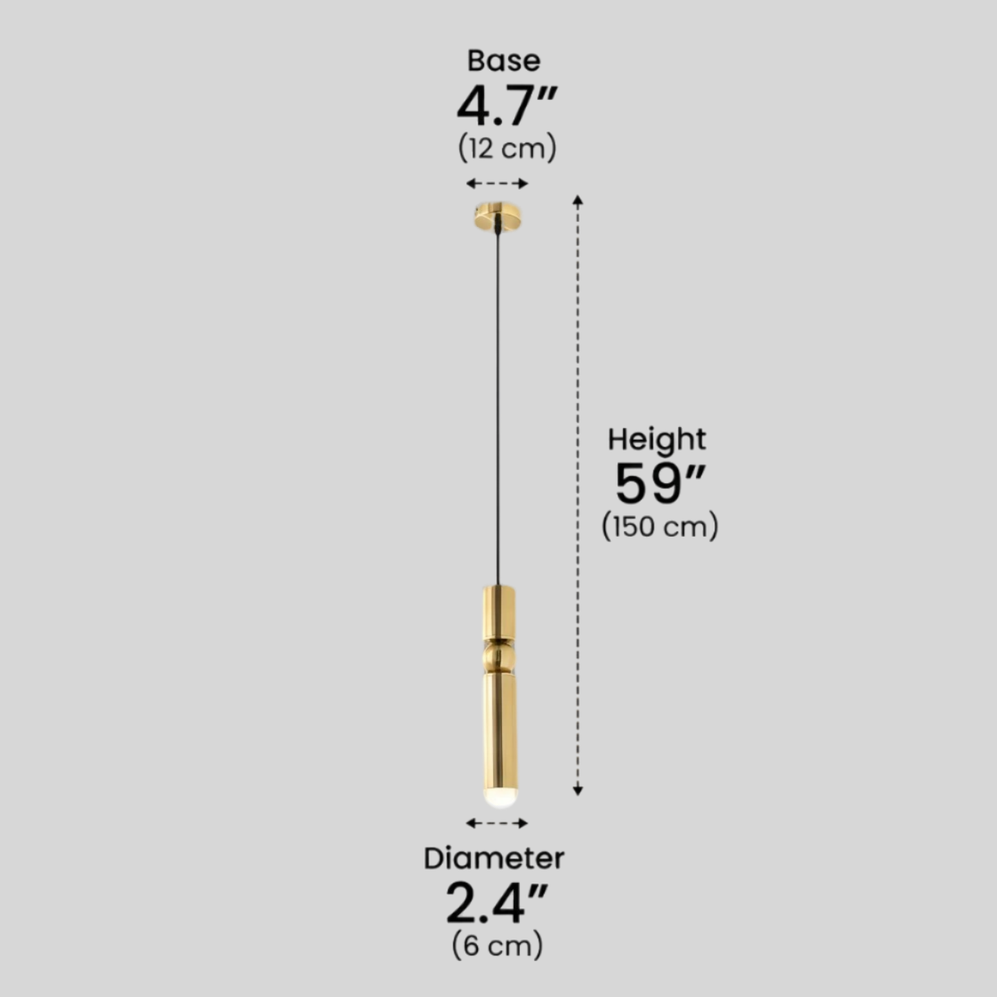 Slender cylindrical pendant in gold or crystal finish, crafted from lightweight aluminum for modern elegance.