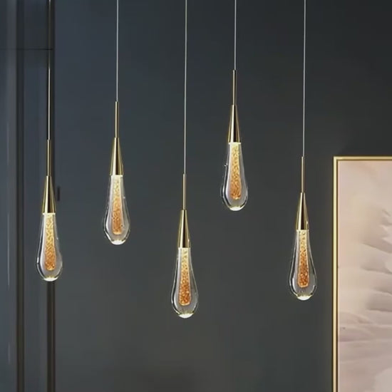 Esta lámpara colgante de inspiración Art Déco presenta un elegante diseño de gota de agua. La combinación de metal dorado y cristal ofrece una estética moderna y refinada. Ideal para dormitorios y comedores, esta lámpara proporciona una iluminación ambiental cálida y puede convertirse en un sutil punto focal en su decoración. La fusión de materiales y diseño le permite complementar una variedad de estilos de interior.