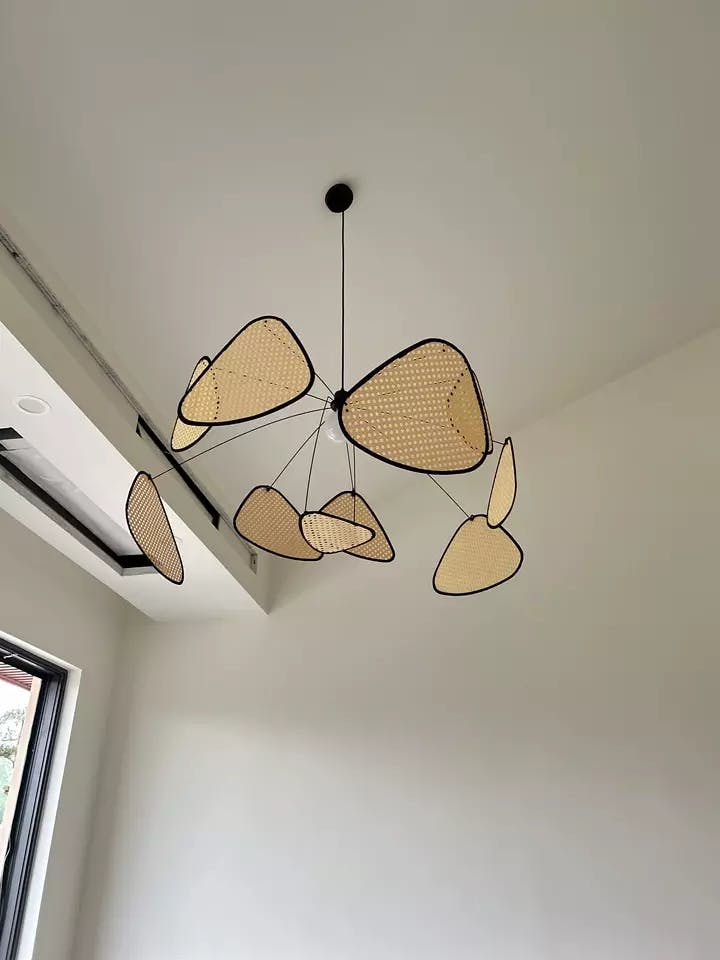 Esta lámpara escultórica, que combina una estructura metálica con paneles de ratán tejidos a mano, añade un elemento decorativo de inspiración zen a los espacios contemporáneos de estar y comedor.