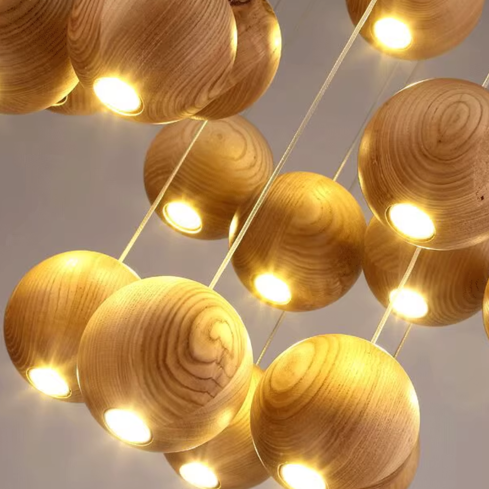 Las cuentas redondas de madera, cuidadosamente dispuestas, proporcionan una textura natural y un sutil interés visual rítmico.
