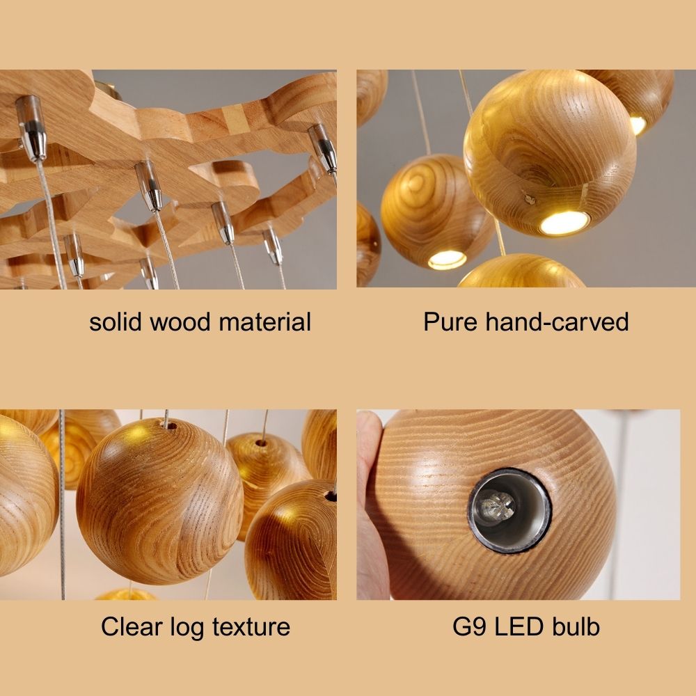 - Cuenta con múltiples esferas de madera con diámetros de 10 cm (4"), 35 cm (14"), 45 cm (18") y 55 cm (18"), con cuerdas ajustables para alturas de suspensión flexibles.