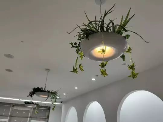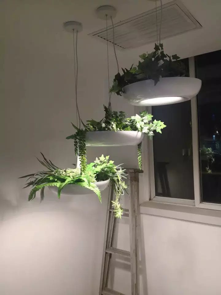 Funciona como lámpara colgante y maceta, ideal para cocinas, mesas de bistró o salas de estar que buscan una estética moderna y orgánica.