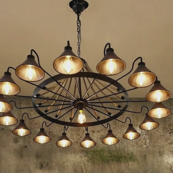 Su estructura en forma de rueda con múltiples luces crea una pieza central llamativa y audaz para cualquier espacio.