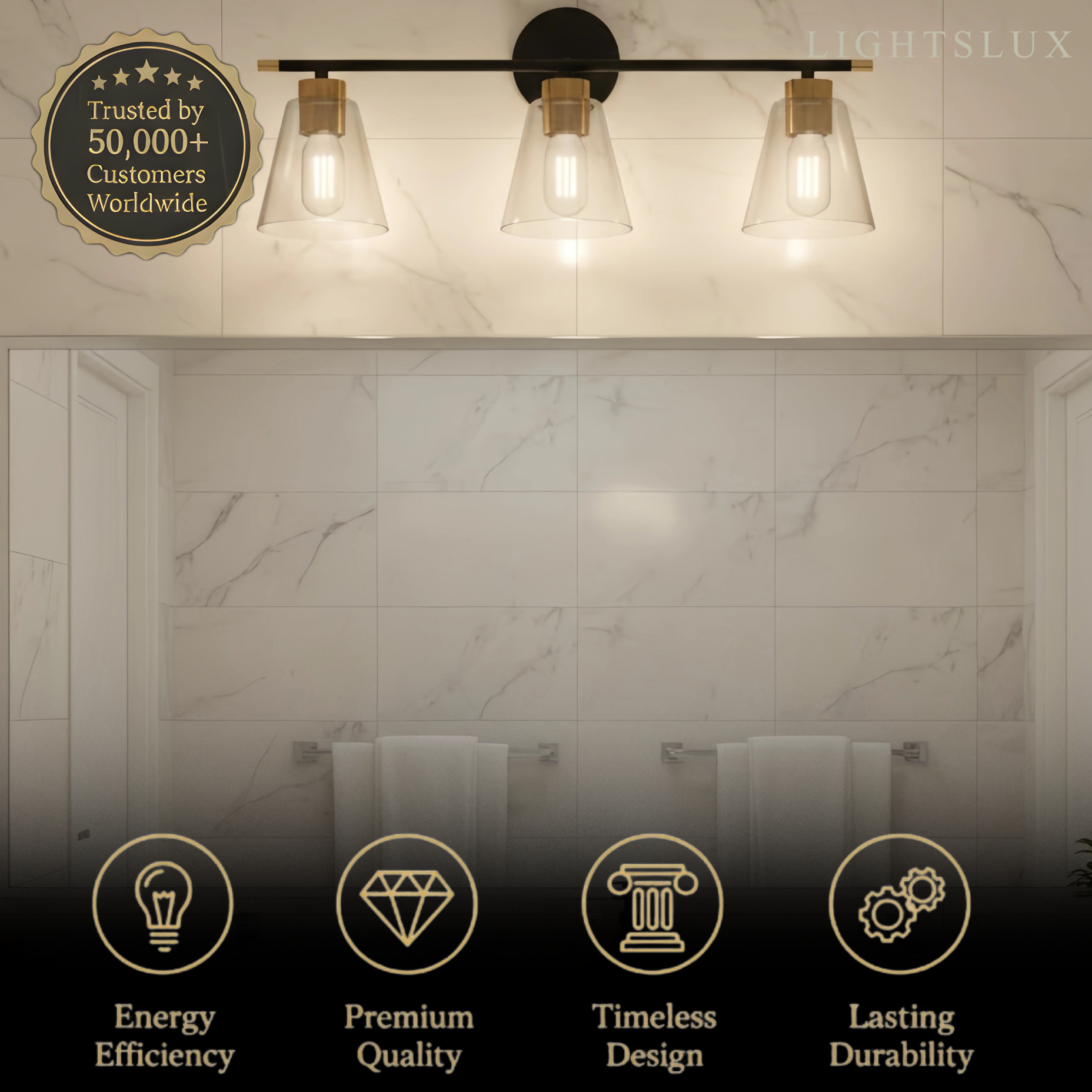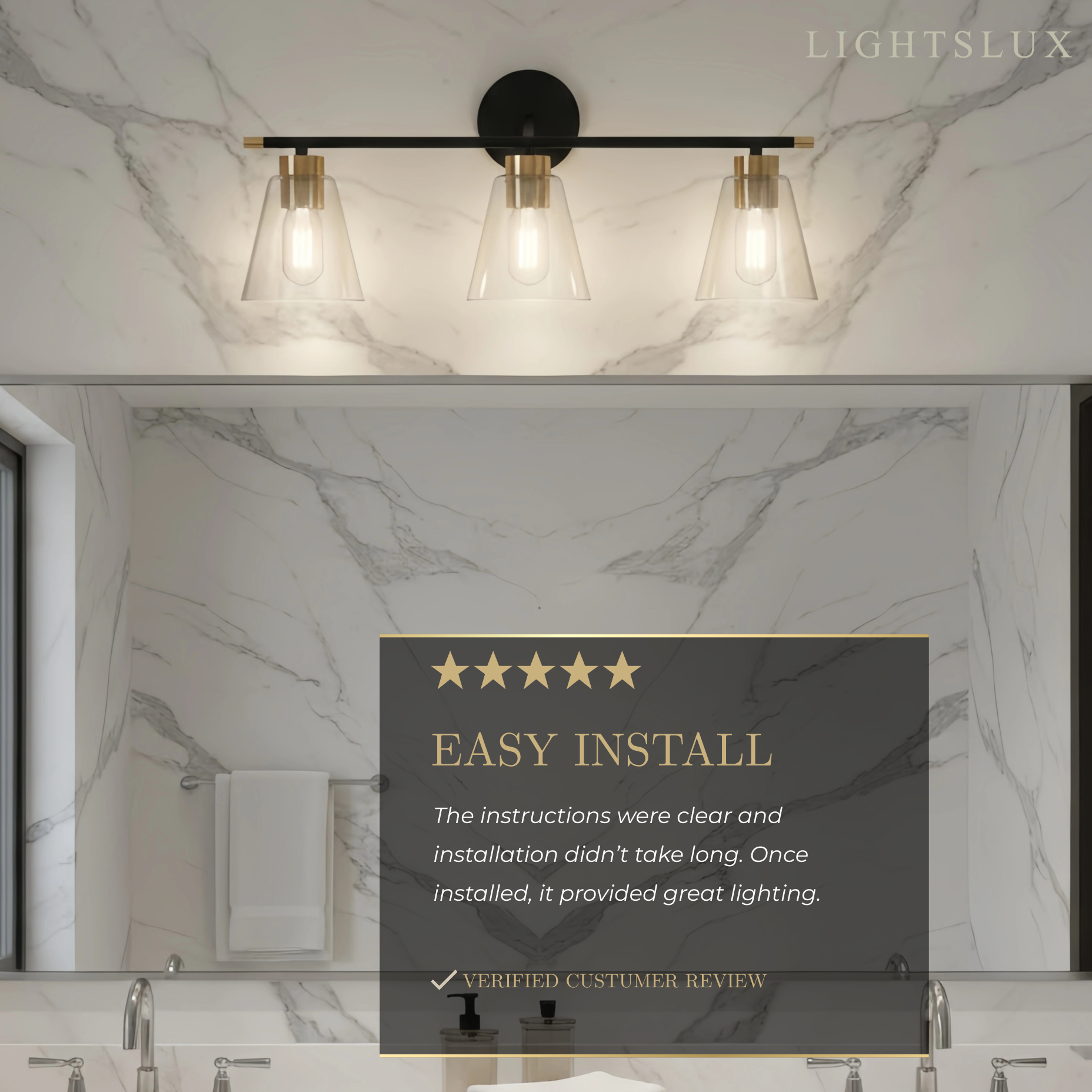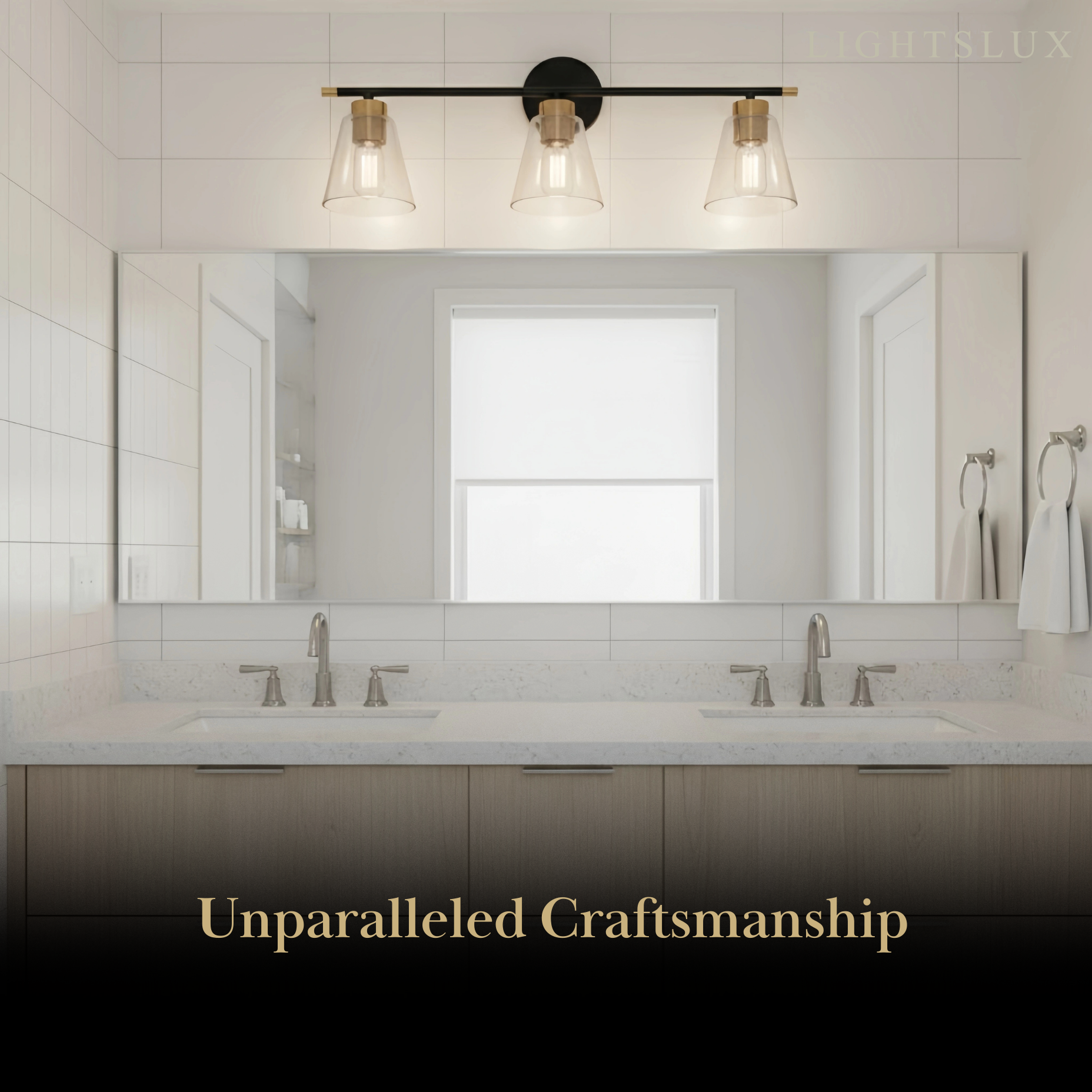 This bathroom vanity light combines refined elegance with modern functionality, featuring a matte black frame accented with brushed gold details and three clear, flared glass shades. Its clean lines and dual-tone finish bring a polished, luxurious touch to any bath or powder room, delivering both style and ample, soft illumination. Designed to seamlessly integrate into contemporary interiors, it offers a sophisticated lighting solution that balances aesthetics with performance.