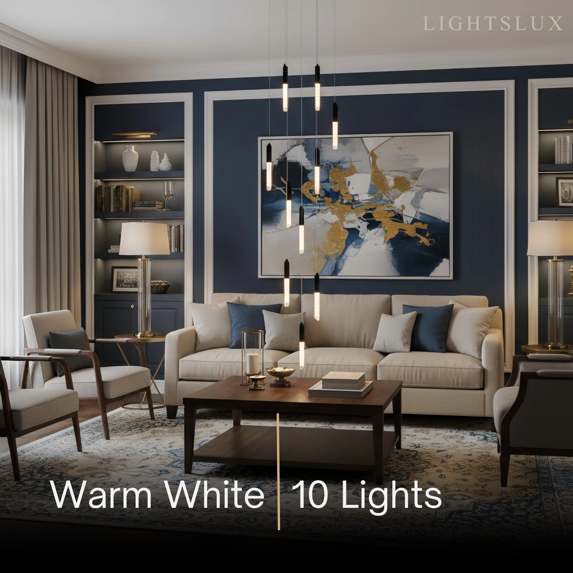 - Utilizes integrated LED light bands for energy-efficient, shimmering illumination with consistent warm white light