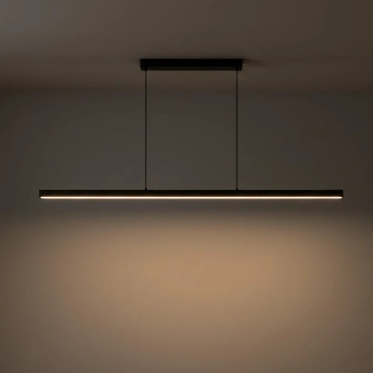 This minimalist horizontal pendant light features a slim bar design suspended from two cables, offering a clean, floating appearance suitable for open spaces. Designed for living rooms, dining areas, or bedrooms, it provides balanced geometry and soft illumination for contemporary interiors.