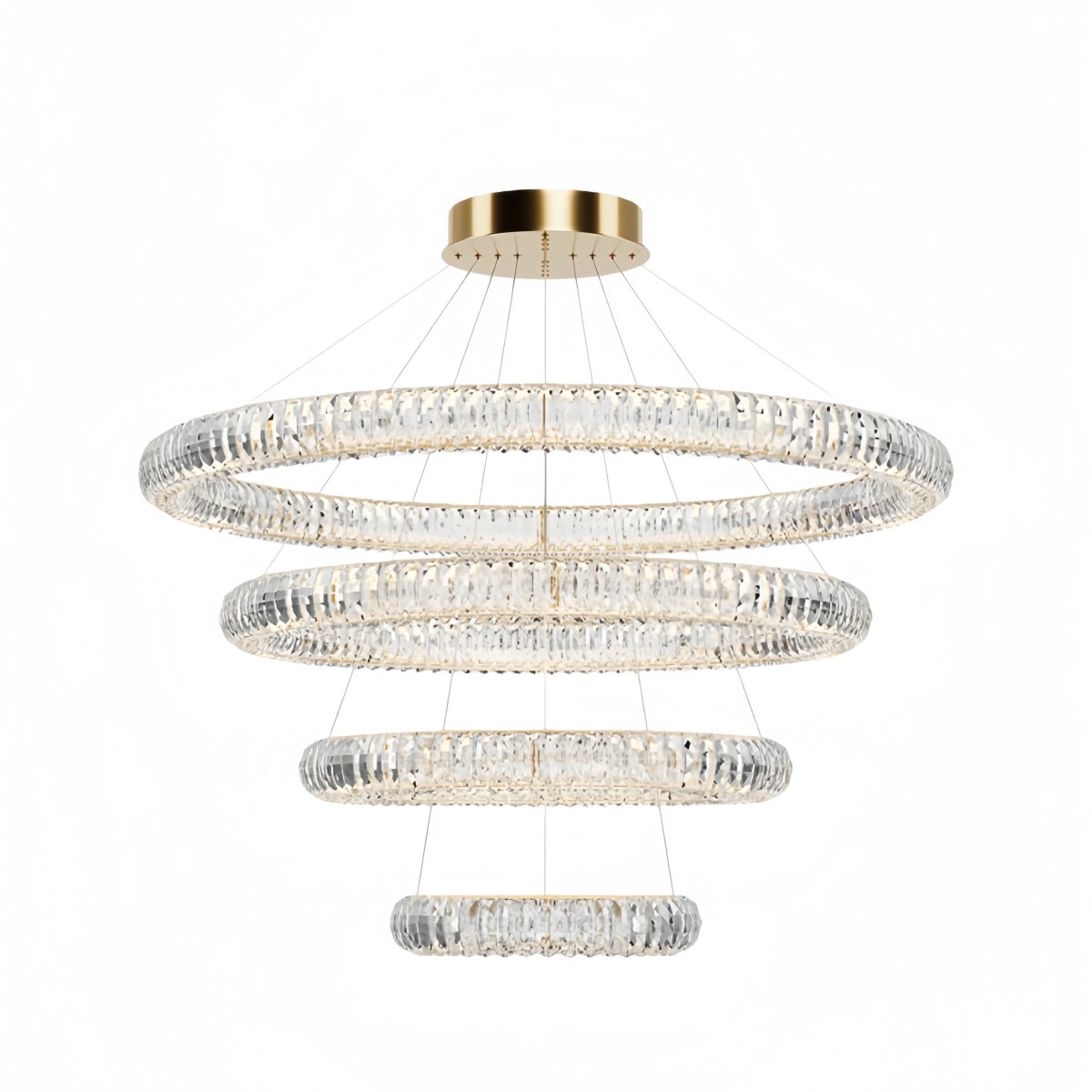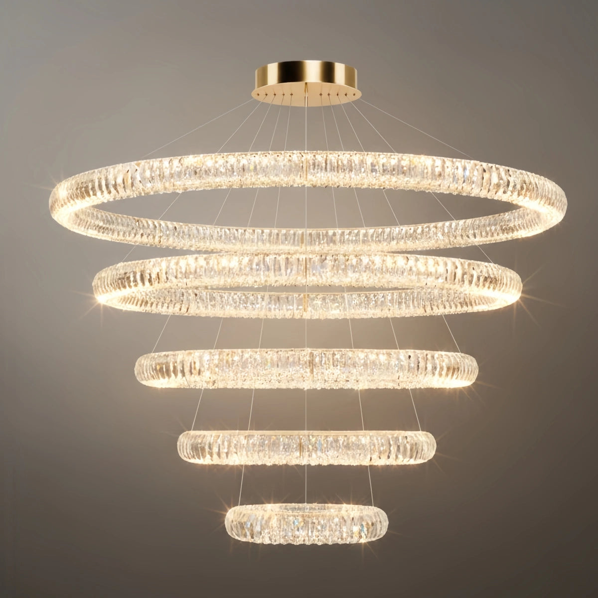 - Features multiple tiered stainless steel rings draped with sparkling K9 crystals, creating a cascading, layered light effect