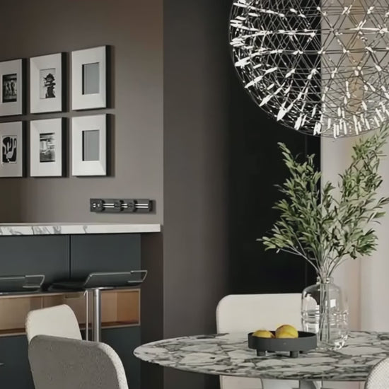 This industrial-style pendant light features a distinctive spherical mesh design that combines urban edge with modern sophistication. The open metal framework creates captivating light patterns while providing ample illumination. Available in four sizes with a sleek silver or gold finish, this versatile fixture adapts to various spaces from cozy bedrooms to elegant dining rooms, offering both functional lighting and striking visual appeal.