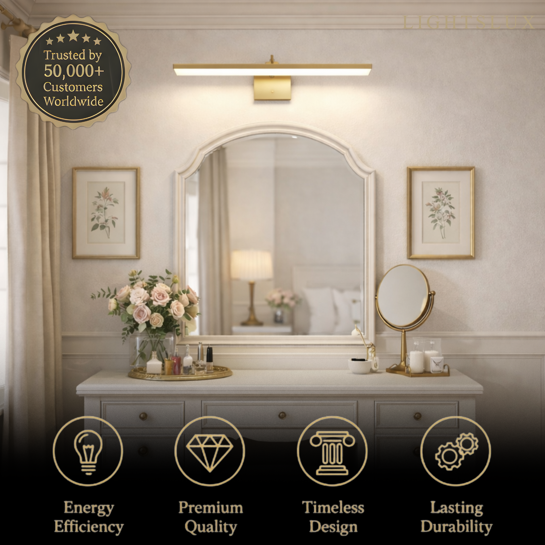 This modern bathroom light combines streamlined design with effective vanity illumination, featuring a slim horizontal light bar that delivers even, soft light perfect for grooming and makeup. Available in matte black or brushed gold finishes, its minimalistic yet luxurious profile enhances contemporary bathrooms with both style and functionality, creating a clean, well-lit environment.