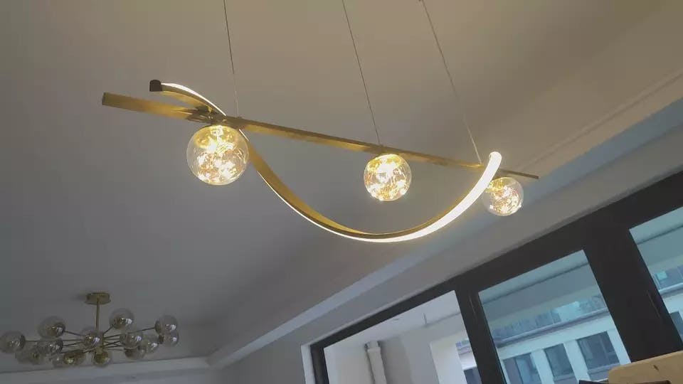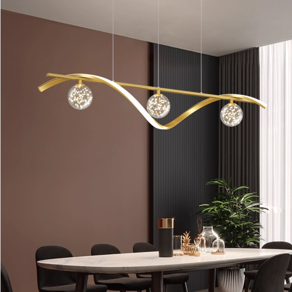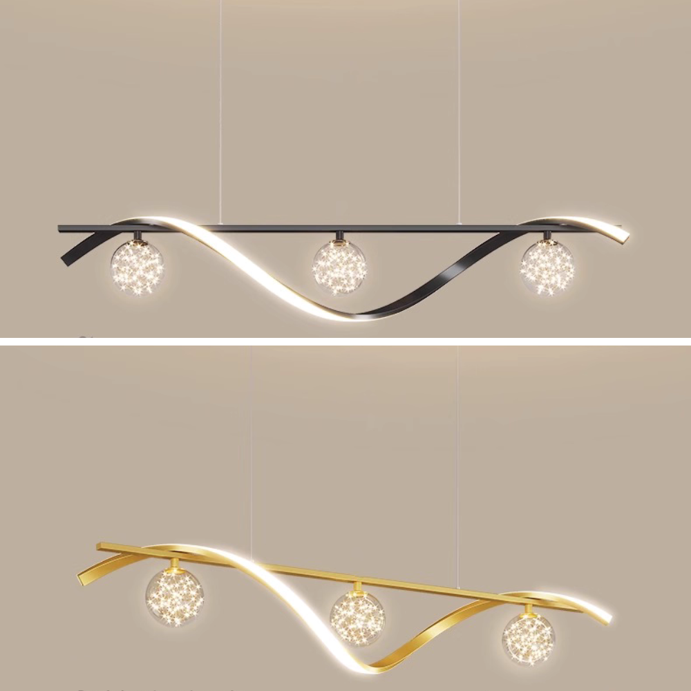 This modern pendant light blends clean lines with smooth curves to create a stylish focal point for dining rooms. Available in black or gold, its metal construction adds warmth and subtle luxury, providing soft illumination while enhancing the overall aesthetic of the space.