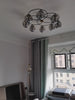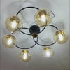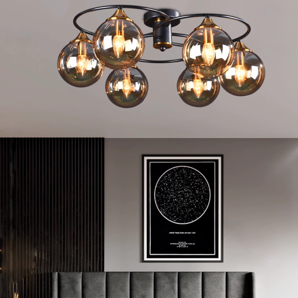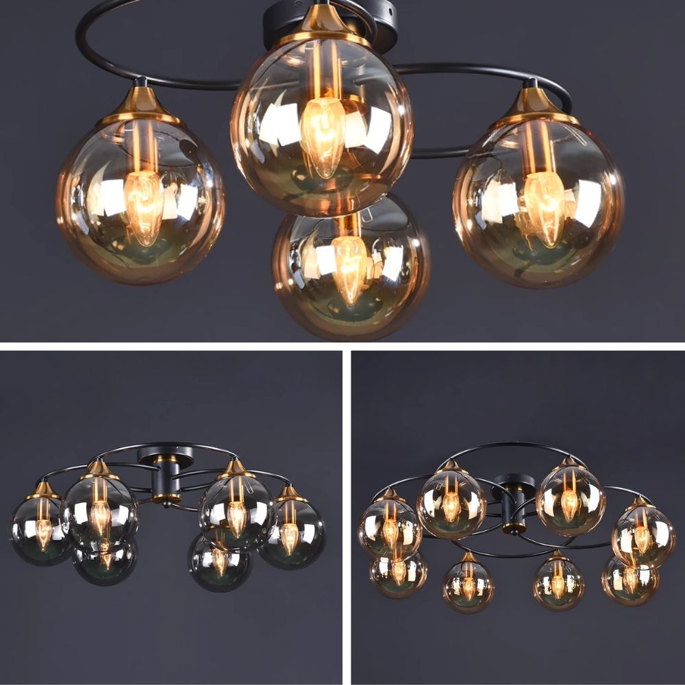 This modern ceiling light combines geometric metal frames with round glass shades, creating visual interest and a subtle focal point for dining rooms or living areas. Available in smoky gray or warm amber finishes, it provides soft, diffused illumination that enhances the atmosphere for both quiet dinners and casual gatherings.