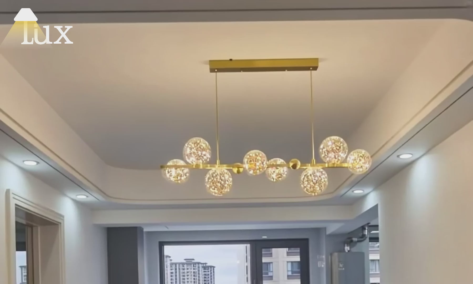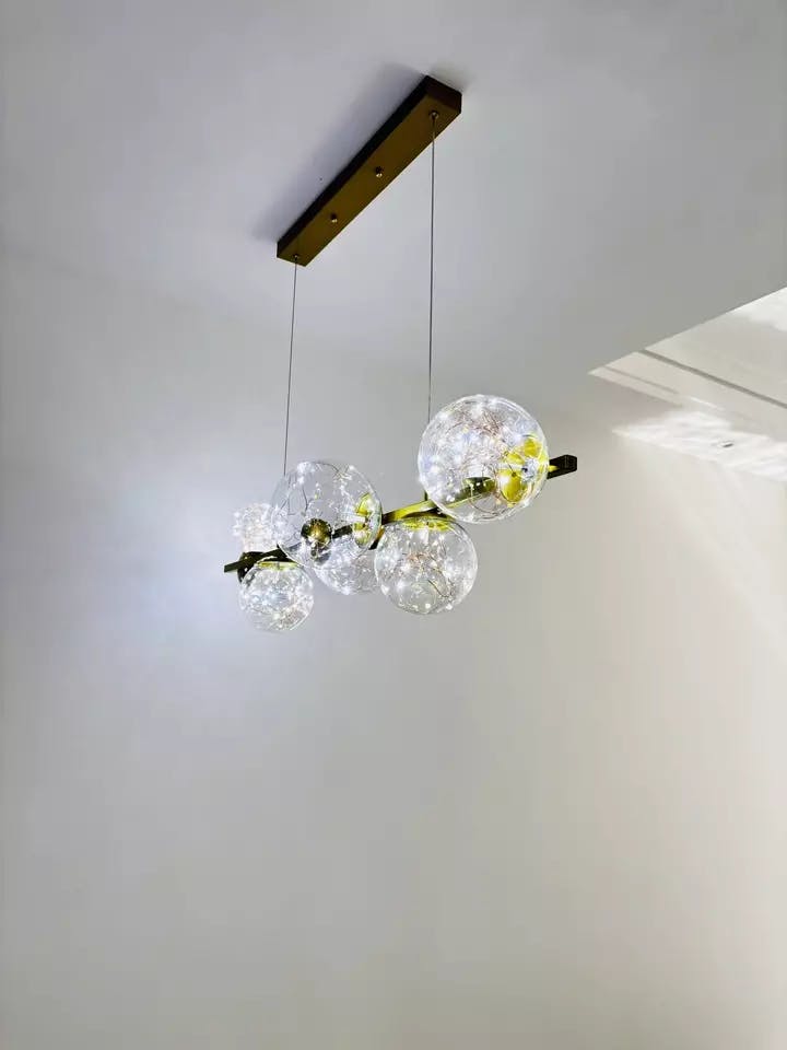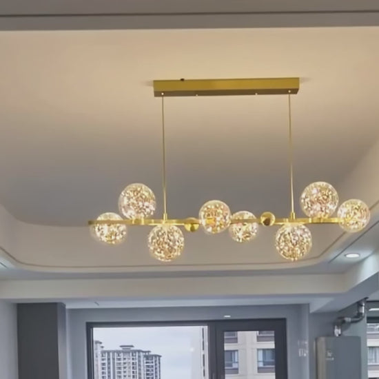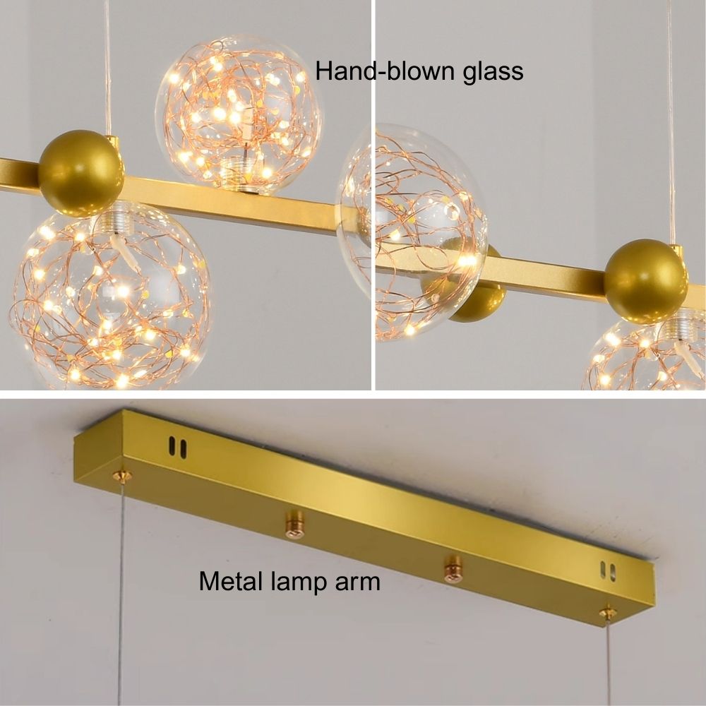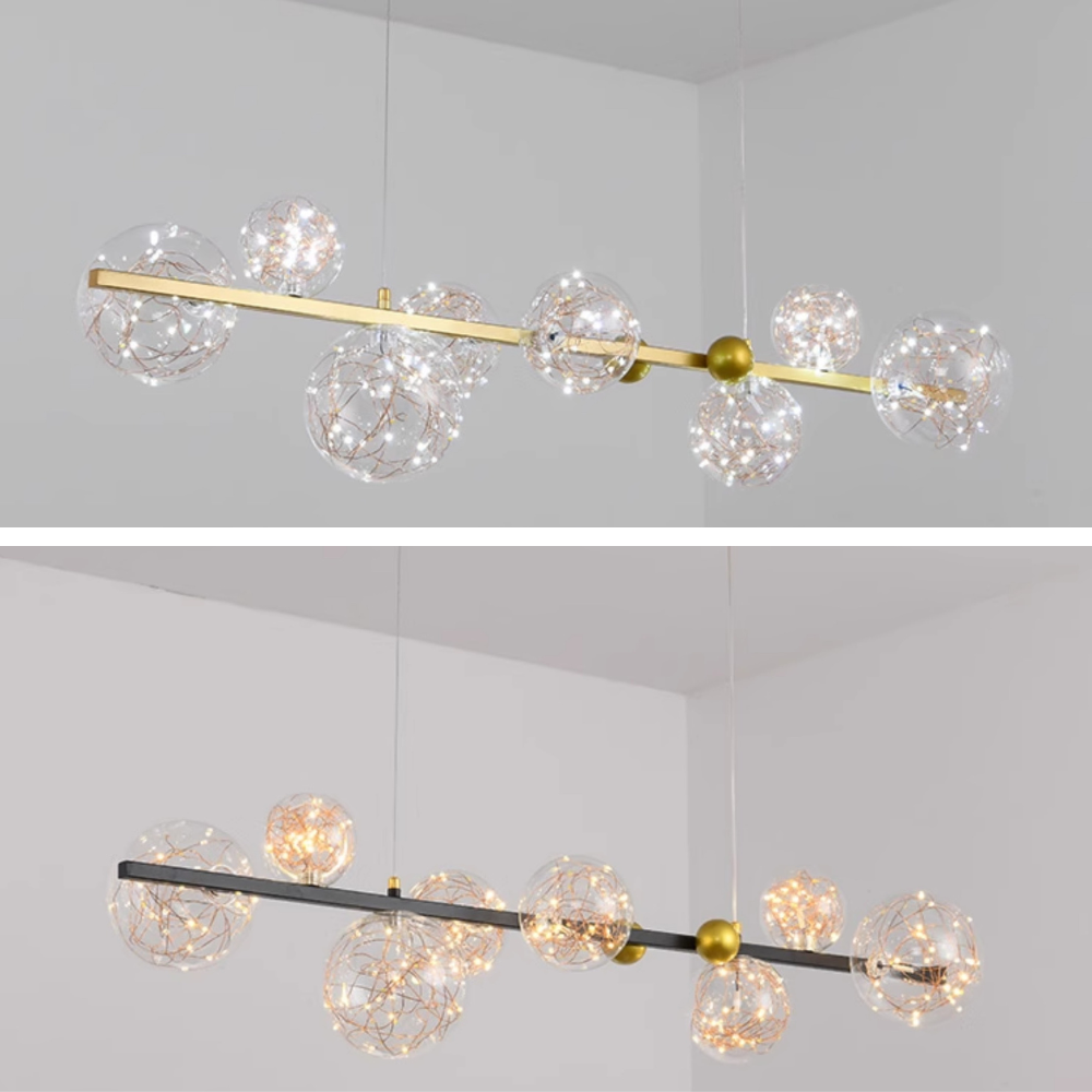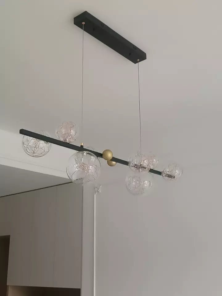 This modern chandelier features a linear design accented by bubble details. Made from durable metal and clear glass, it combines style with functional illumination. Suitable for kitchen islands, dining rooms, or living areas, it provides both task lighting and decorative appeal. Available in gold and black finishes, it complements contemporary or vintage interiors while adding visual interest to the space.