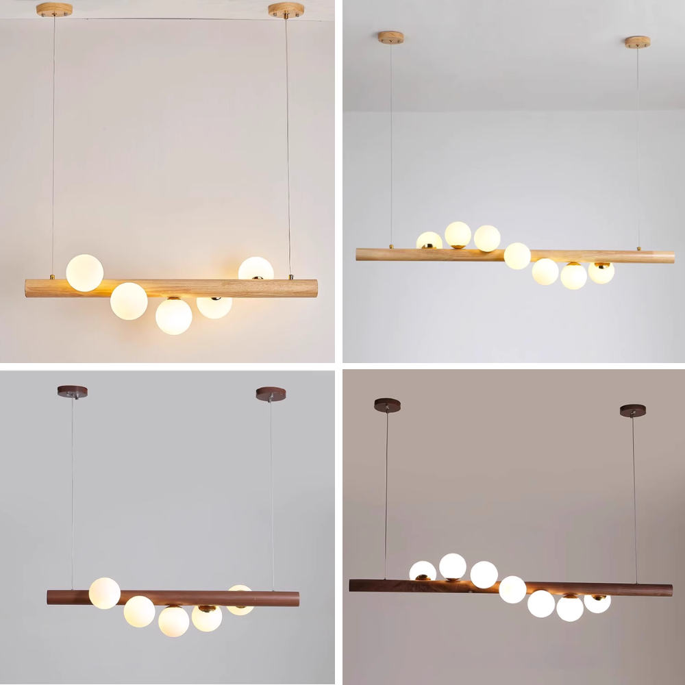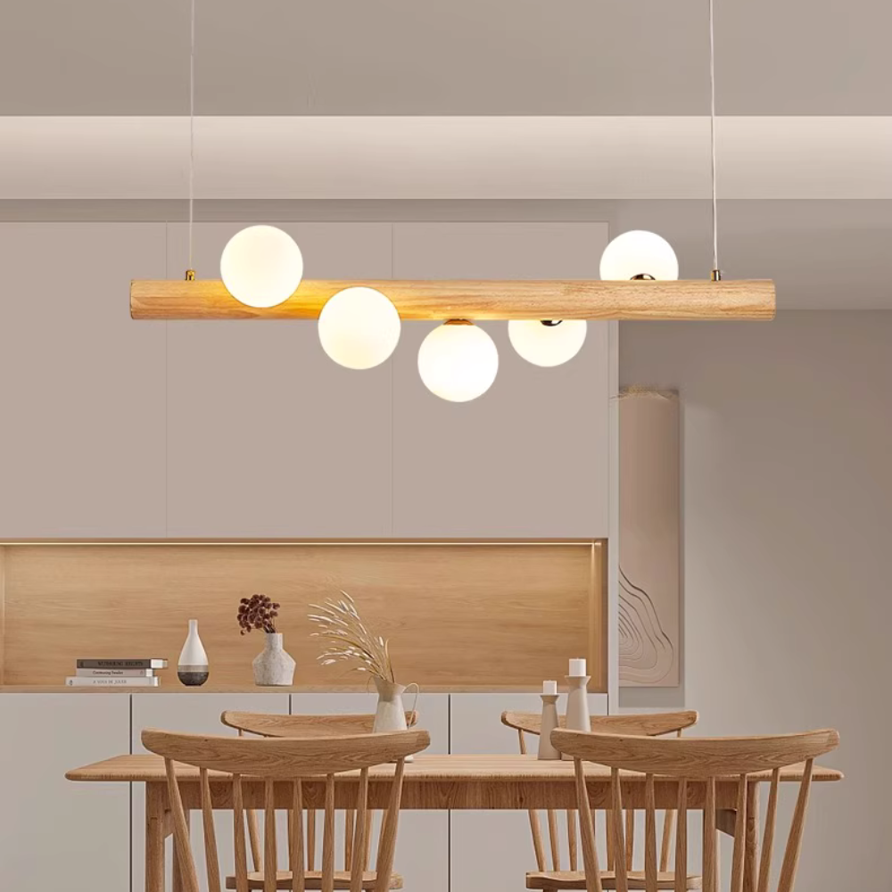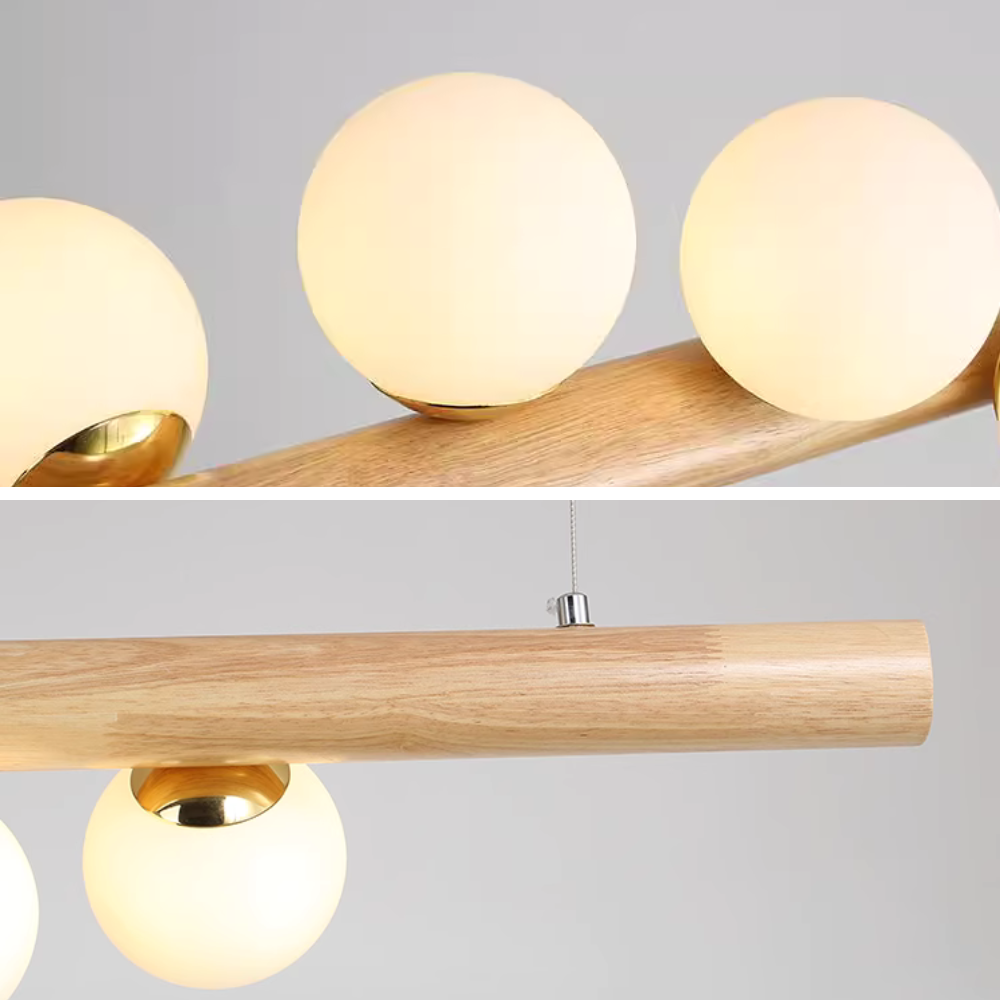 - Features a sustainably sourced wooden beam supporting multiple glass sphere pendants, offering balanced and gentle illumination.