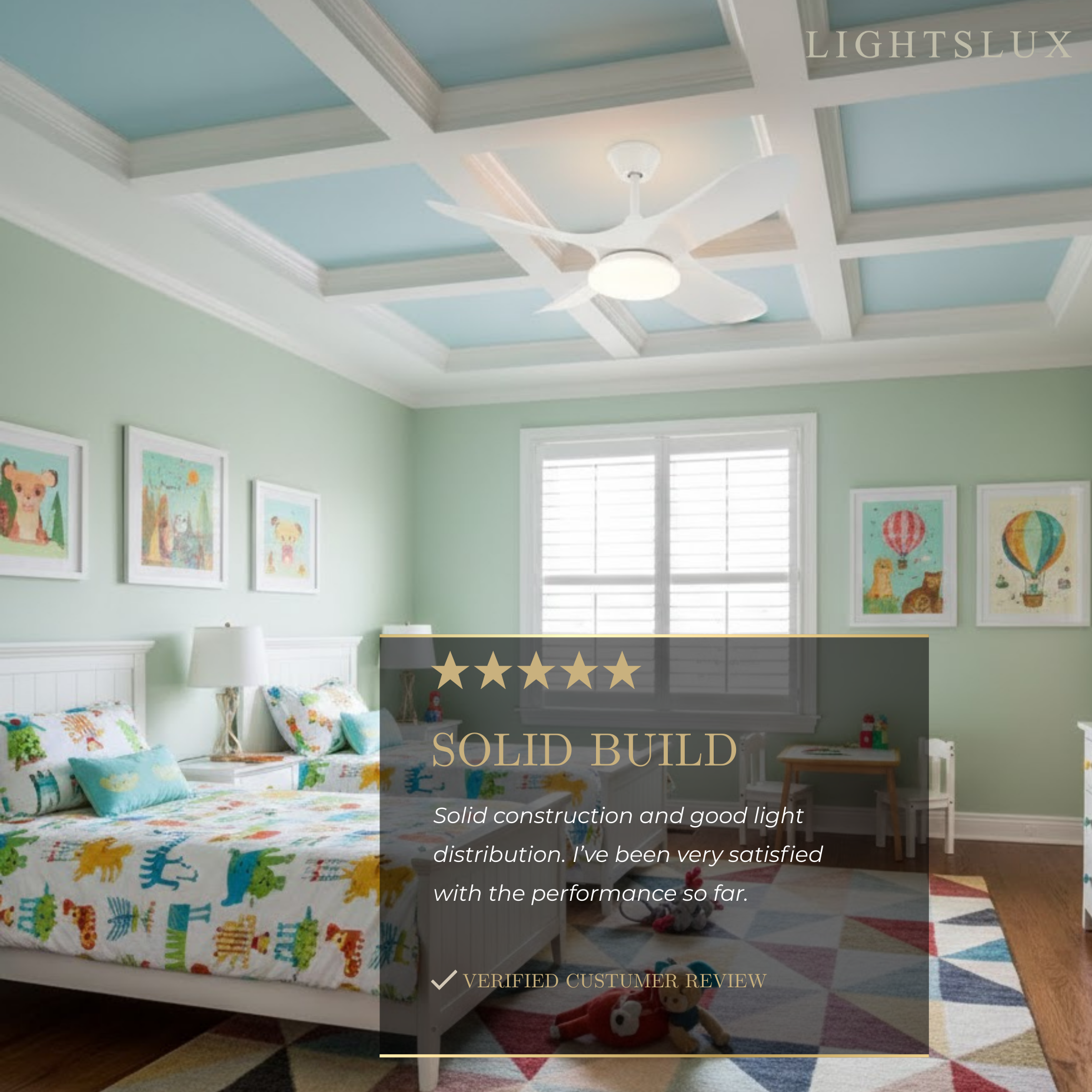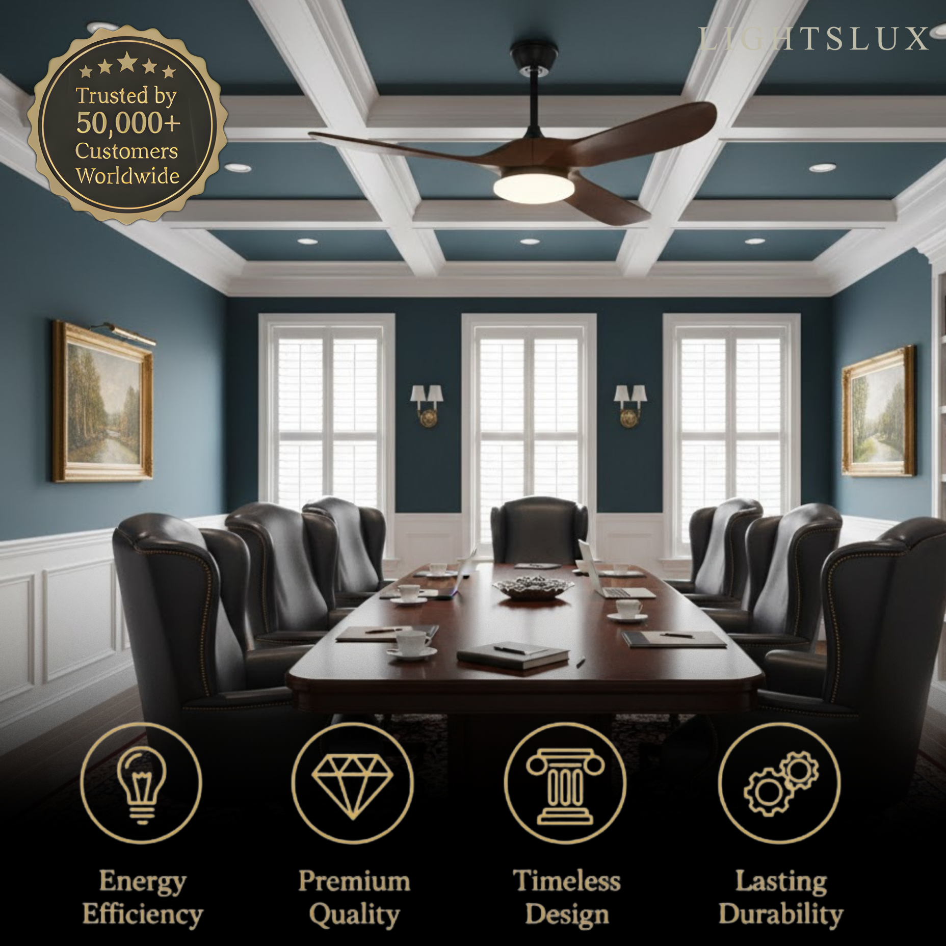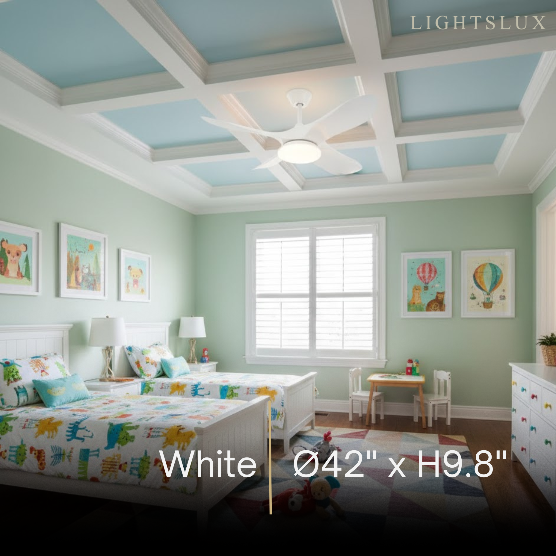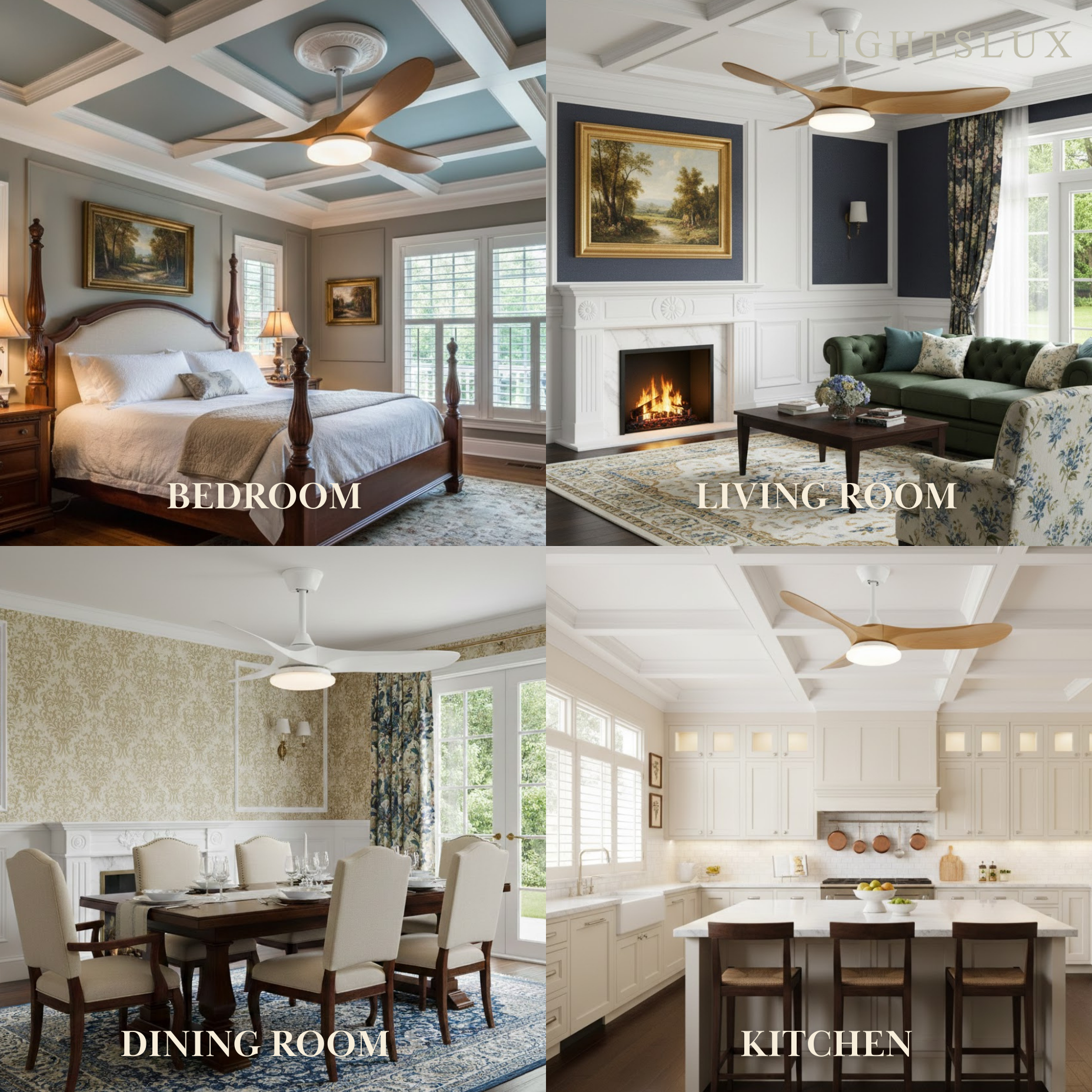 - Materials: Metal frame, Solid wood blades, Acrylic shade, Pure copper motor