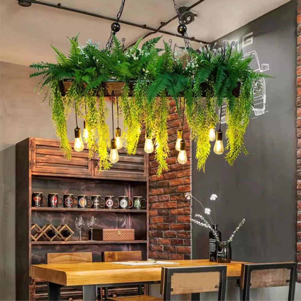 Bring a touch of nature to your space with this botanical-inspired pendant light, featuring cascading artificial greenery around a central bulb. With its generous 110 cm length, it creates the impression of a hanging garden, making it well-suited for cafes, restaurants, or kitchen islands. The warm light filters through the leaves, casting gentle shadows and adding a natural, inviting focal point to the room.