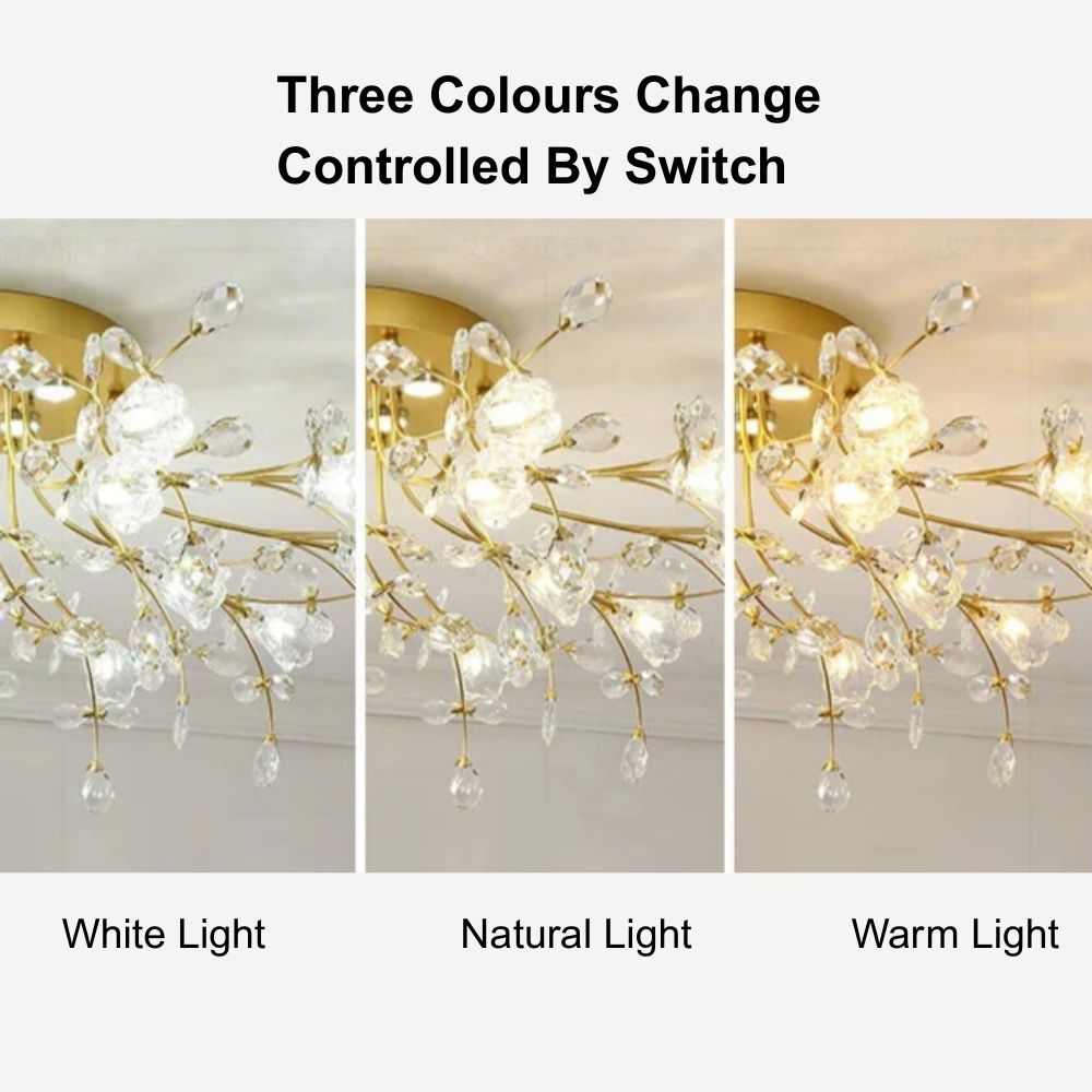 Enhance your home ambiance with this floral-inspired flush mount ceiling light, featuring a vine-like metal silhouette paired with transparent glass elements that reflect light with clarity. Designed to combine natural charm with subtle sophistication, this fixture is suitable for living rooms, bedrooms, and dining areas, particularly in European-style or modern minimalist interiors. Crafted from durable metal and high-transparency glass, it offers both decorative appeal and long-lasting performance. The integrated LED light provides three adjustable color temperatures (warm, natural, and white light), allowing you to create the desired atmosphere, making this piece a versatile and stylish addition to home interiors.
