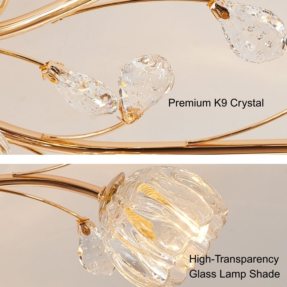Constructed with high-quality K9 crystal, a clear glass shade, and a sturdy metal frame, offering a refined and polished appearance.