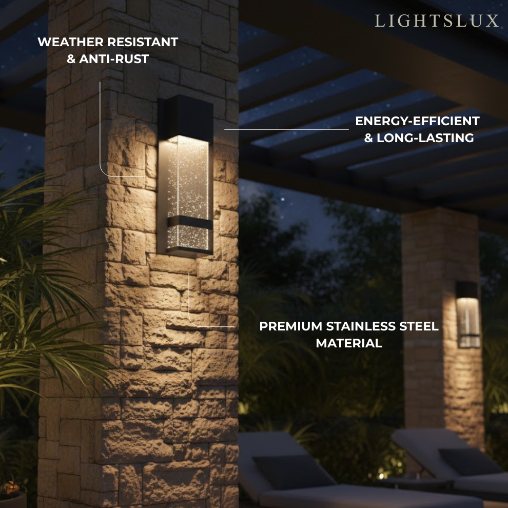Introducing a modern outdoor wall sconce that combines a bold vertical silhouette with refined design details. Featuring a sleek black stainless steel frame and bubble-textured glass, it emits a soft, star-like radiance that transforms entrances, patios, and exterior walls into inviting and atmospheric spaces. This fixture is both a striking architectural accent and a reliable source of ambient light for any outdoor setting.